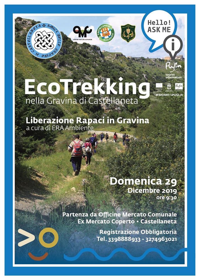 Domenica mattina 29 Dicembre con gli Amici delle Gravine di Castellaneta torneremo nella maestosa Gravina Grande a contatto con la Natura. Prima di iniziare la discesa sul fondo gravinale, l’Associazione ERA-Ambiente effettuera’ la liberazione in natura, di un esemplare di rapace tipico delle nostre zone. Con la biologa Delia Grabriella parleremo di ambiente, rispetto e tutela di un patrimonio inestimabile come quello delle Gravine dell’Arco Jonico. In occasione della mattinata, con il contributo dell’Assessorato all’Ambiente di Castellaneta, sara’ possibile contribuire alla manutenzione delle aree naturalitiche con la raccolta di piccoli rifiuti abbandonati lungo il percorso.