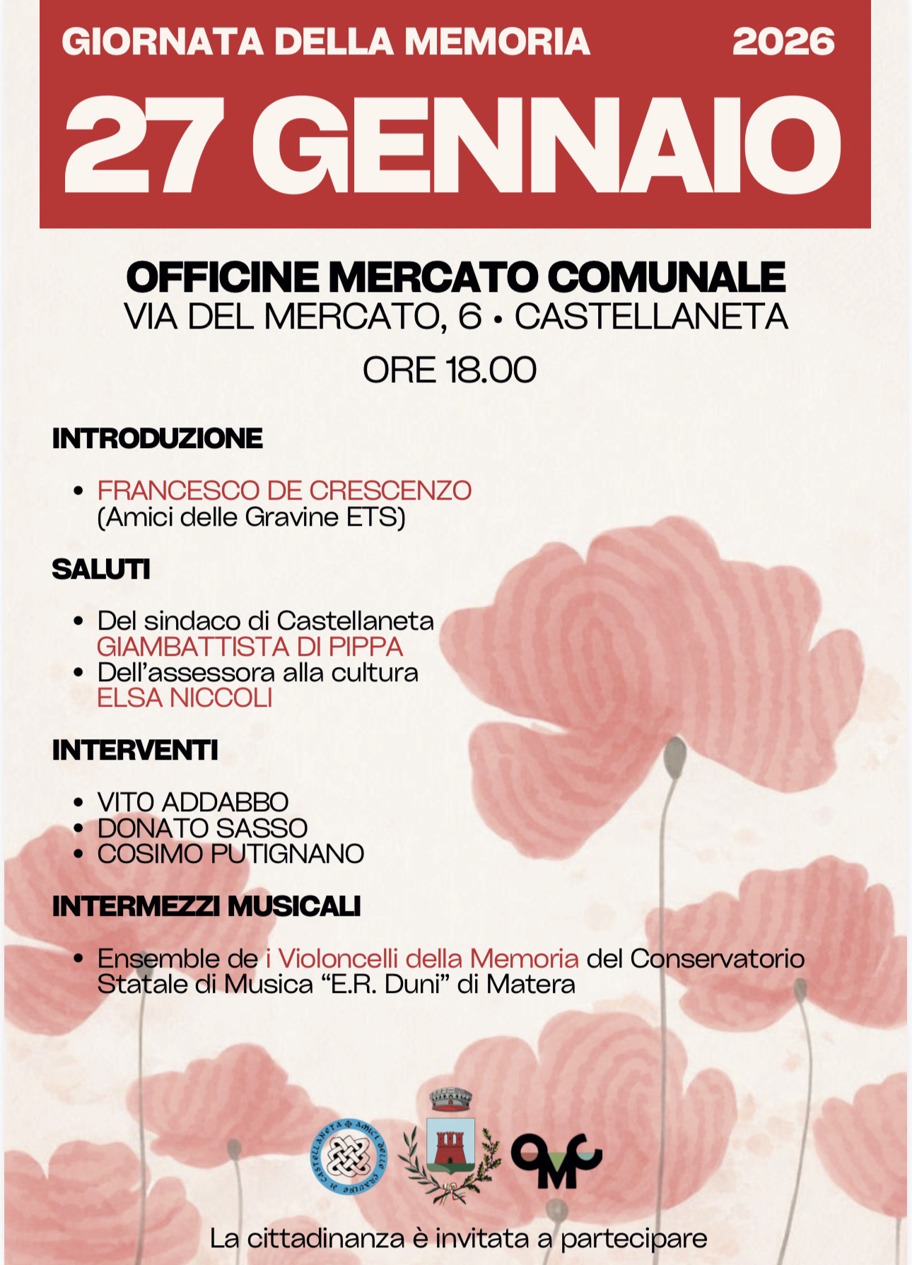 Per il 5ยฐ anno consecutivo, L’associazione Culturale Amici delle Gravine di Castellanta ETS in collaborazione con l’Artista Vito Addabbo, dott. Donato Sasso e dott. Cosimo Putignano vi invitano a partecipare all’evento sulla โ€œ๐†๐ข๐จ๐ซ๐ง๐š๐ญ๐š ๐๐ž๐ฅ๐ฅ๐š ๐Œ๐ž๐ฆ๐จ๐ซ๐ข๐šโ€ ๐œ๐ก๐ž ๐ฌ๐ข ๐ญ๐ž๐ซ๐ซ๐šฬ€ ๐ฆ๐š๐ซ๐ญ๐ž๐๐ข ๐Ÿ๐Ÿ• ๐†๐ž๐ง๐ง๐š๐ข๐จ ๐Ÿ๐ŸŽ๐Ÿ๐Ÿ“ ๐š๐ฅ๐ฅ๐ž ๐จ๐ซ๐ž ๐Ÿ๐Ÿ–.๐จ๐จ presso le