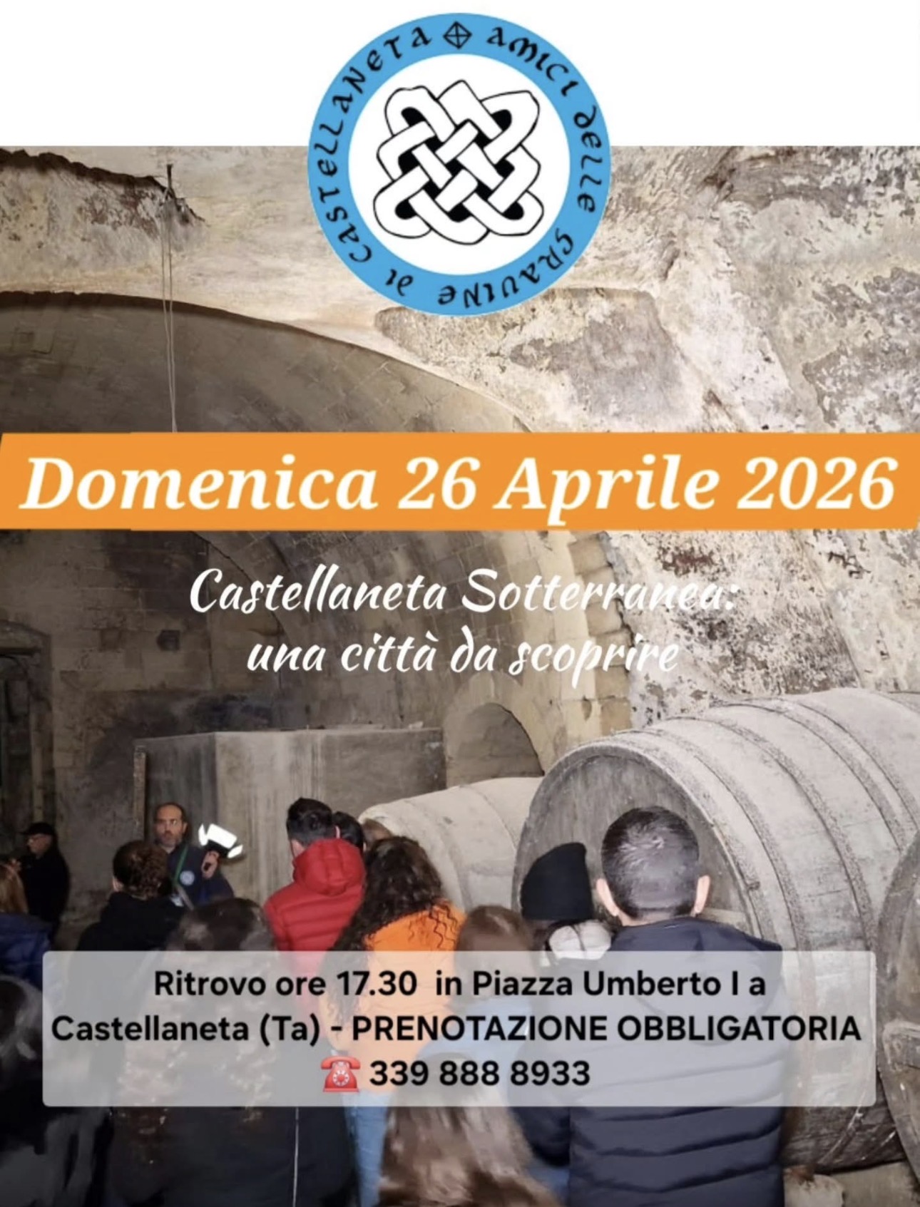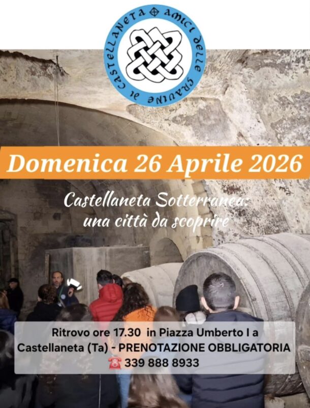 ๐——๐—ข๐— ๐—˜๐—ก๐—œ๐—–๐—” ๐Ÿฎ๐Ÿฒ ๐—”๐—ฝ๐—ฟ๐—ถ๐—น๐—ฒ ๐Ÿฎ๐Ÿฌ๐Ÿฎ๐Ÿฒ ๐—ผ๐—ฟ๐—ฒ ๐Ÿญ๐Ÿณ.๐Ÿฏ๐Ÿฌ si riaprono le porte della ๐—–๐—ฎ๐˜€๐˜๐—ฒ๐—น๐—น๐—ฎ๐—ป๐—ฒ๐˜๐—ฎ ๐—ฆ๐—ผ๐˜๐˜๐—ฒ๐—ฟ๐—ฟ๐—ฎ๐—ป๐—ฒ๐—ฎ. L’ Associazione Culturale Amici delle Gravine di Castellaneta, organizza unโ€™affascinante #TOUR nel sottosuolo del centro storico, alla scoperta di antichi cunicoli, grotte ed ipogei che costituiscono una vera e propria cittร  sotterranea. In questi anni importanti scoperte sono state fatte, insieme andremo […]