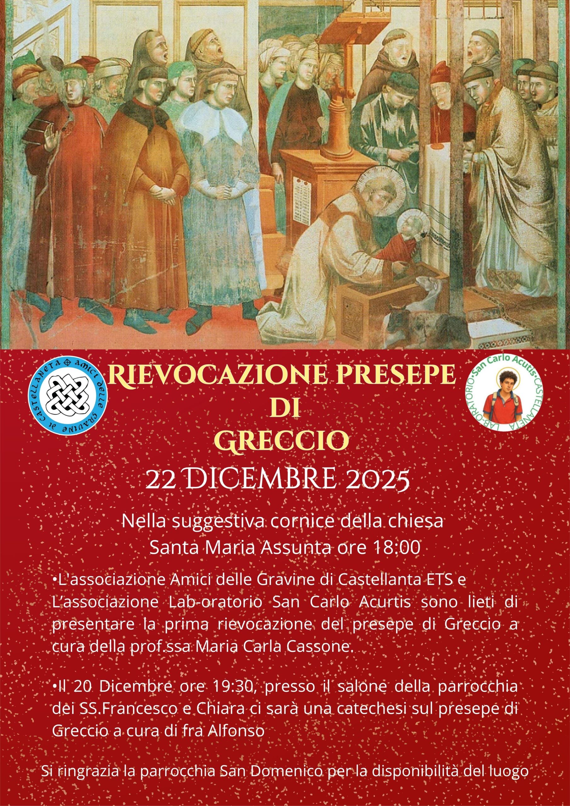 Nella cornice della chiesa di Santa Maria Assunta giorno 22 Dicembre 2025 l’associazione Amici delle Gravine di Castellaneta ETS e l’associazione Lab-oratorio San Carlo Acutis Castellaneta coordinati dalla prof.ssa Maria Carla Cassone daranno vita alla rievocazione del presepe di Greccio, ci teniamo a precisare che non è il presepe vivente, ma la rievocazione della storia […]