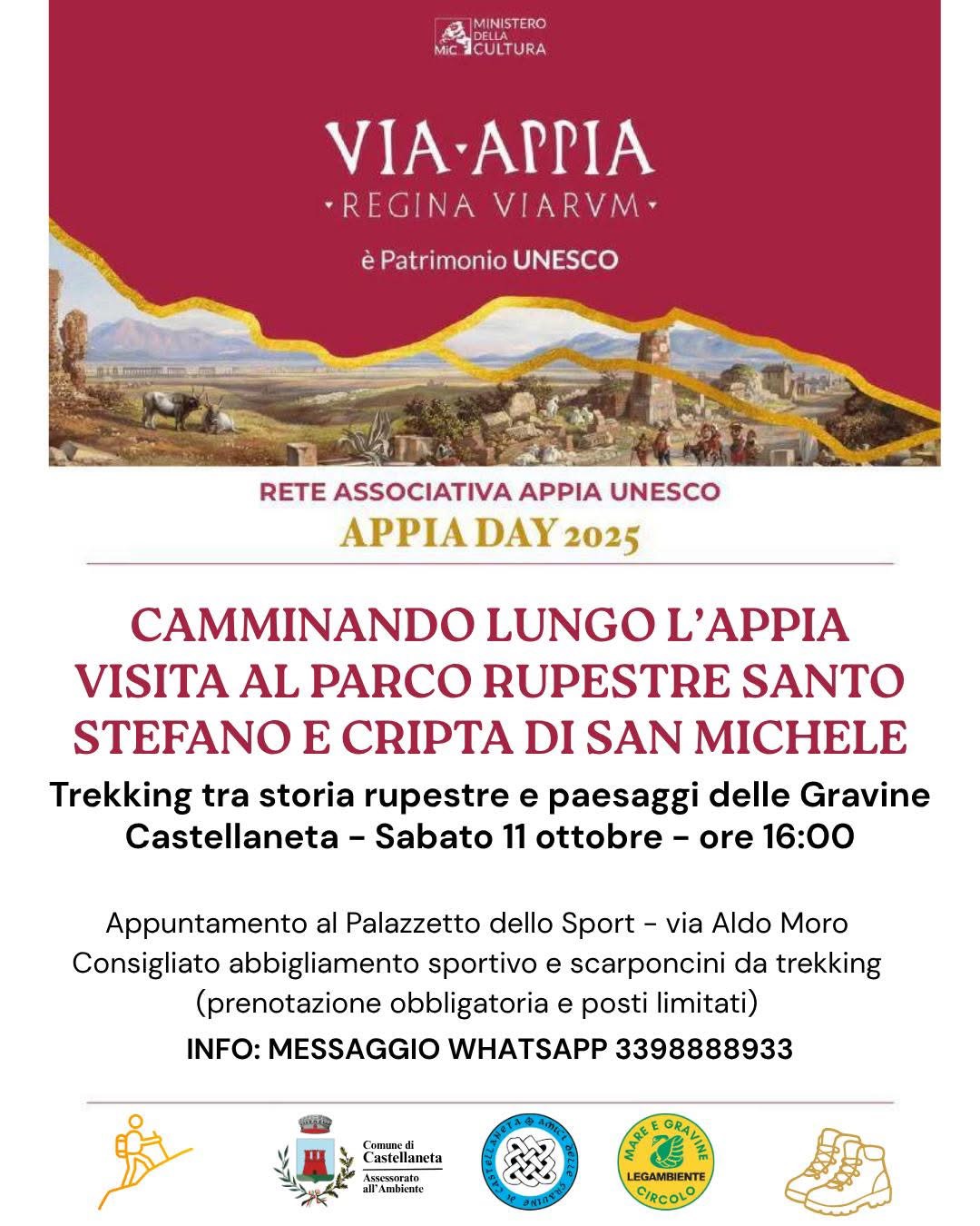 Appia Day, il festival diffuso che celebra ogni anno la bellezza senza tempo della Via Appia Antica, fa tappa a Castellaneta, con un trekking archeologico lungo la Regina Viarum, tra storia rupestre e paesaggi delle Gravine, organizzato dal Circolo Legambiente “Mare e Gravine” di Castellaneta (membro della Rete Territoriale Appia Regina Viarum) e dagli Amici delle Gravine di Castellaneta, con il patrocinio morale del Comune di Castellaneta.